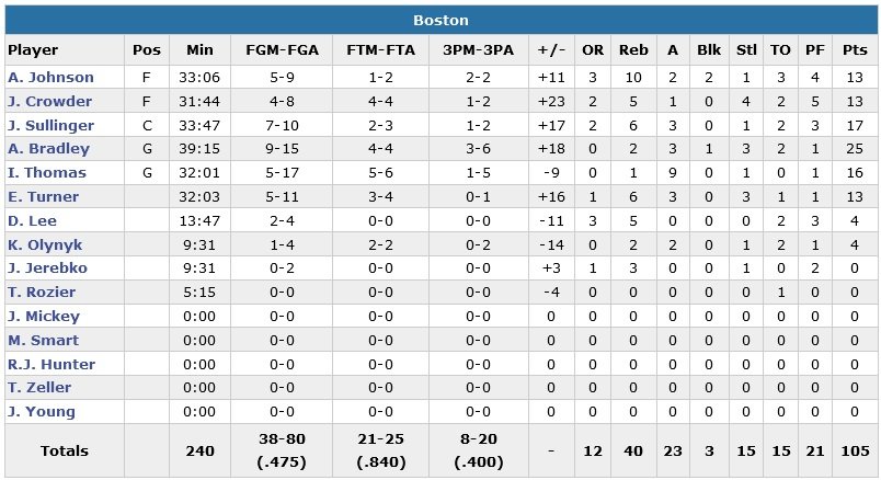Jared Sullinger ajoute 17 points (7/10, 6 rebs) et les 5 titulaires de l’équipe visiteuse terminent tous à minimum 10 points. Mené de 14 points, le Heat réduit l’écart à un point dans le 4e quart-temps mais n’aura jamais mené au score après la mi-temps. Chris Bosh a joué malade (21 points à 8/17, 10 rebs, 5 passes). Son équipe réduit l’écart à une possession à 5 occasions dans les 14 dernières minutes. Boston a su répondre à chaque fois.