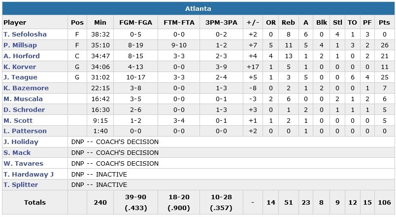 Avec 26 points de Paul Millsap (8/19, 11 rebonds, 5 passes, 4 contres) et de gros shoots de Jeff Teague (10/17, 3 rebonds, 5 passes) dans le money time, les Hawks se sont débarassés non sans mal d’un Thunder qui restait sur 4 victoires consécutives cette nuit, 106-100.