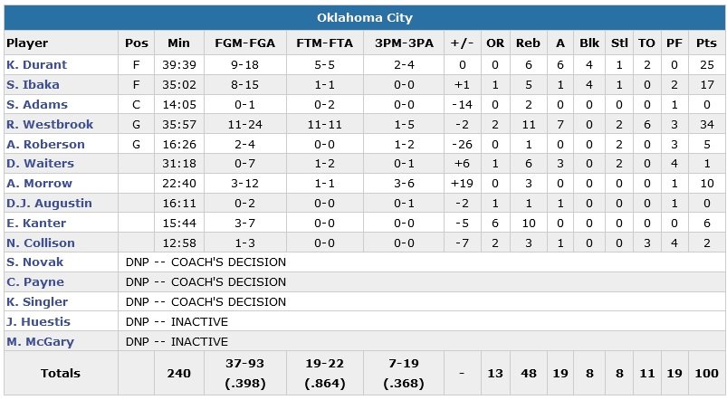 Russell Westbrook marque 17 de ses 34 points (11/24, 11 rebonds, 7 passes) dans le 4e quart-temps dont 2 sur un drive qui donne le premier avantage du Thunder depuis le premier panier du match à 2’49. Mais son ballon perdu à 38.9 secondes de la fin et alors que son équipe avait désespérément besoin de points (98-96 Hawks) coûte cher à OKC. Kevin Durant termine lui à 25 points à 9/18, 6 rebonds, 6 passes et 4 contres et perd pour la 1ère fois depuis son retour. Al Horford inscrit 21 points à 8/15 et prend 13 rebonds pour former un trio avec Teague et Millsap.