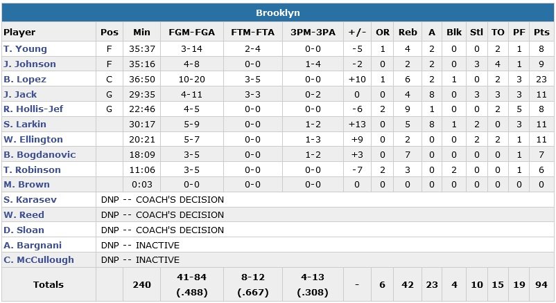 Brooklyn a remporté un 4e succès de rang au Barclays Center cette nuit, 94-91. Brook Lopez signe 23 points à 10/20 et 6 rebonds et est accompagné par 3 joueurs à 11 points (Shane Larkin, Wayne Ellington, Jarrett Jack) face aux Suns de Brandon Knight (26 points).