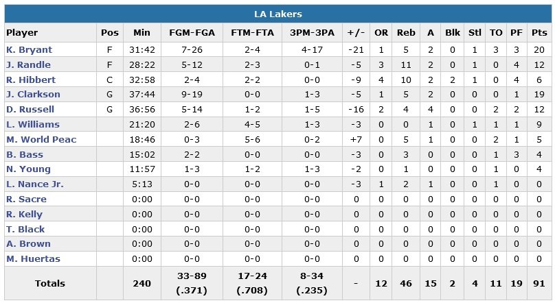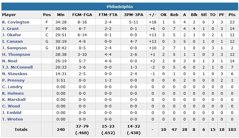 Les fans chantent désormais « Beat L.A. ! » alors que Jahlil Okafor (12 points à 6/14, 5 rebonds, 2 passes) creuse un écart de 14 points 94-80 sur un layup pour des 76ers qui ont shooté à 46.8% et 14/32 derrière la ligne.