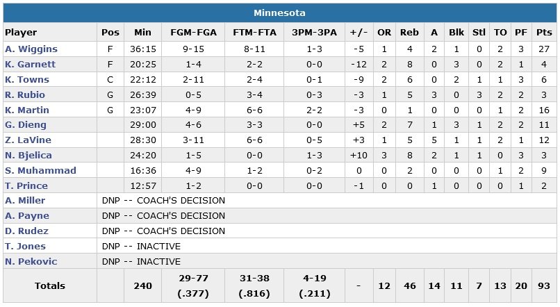 À noter : Evan Fournier termine à 12 points à 4/7 et 3 passes. Karl-Anthony Towns a été limité à 6 points à 2/11 et n’a pas joué du 4e quart. Pour son retour après 2 matchs d’absence (cheville), Ricky Rubio n’était pas non plus en grande forme avec 3 points à 0/5 et 5 passes.