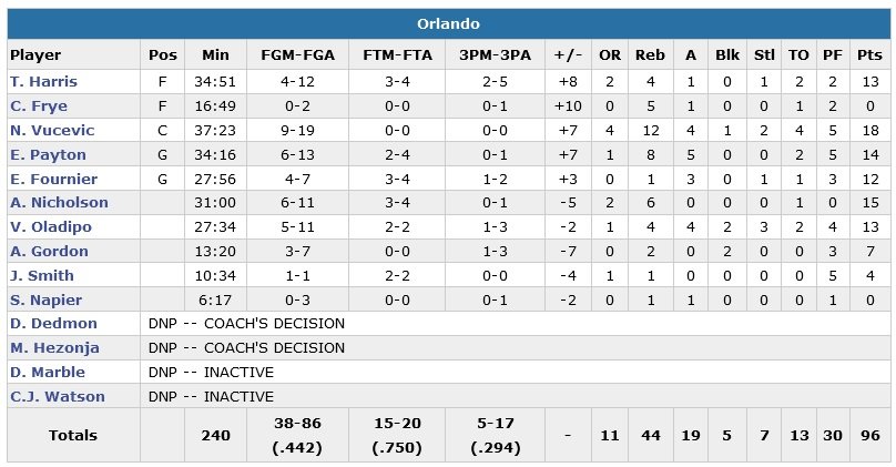 Kevin Martin apporte davantage d’intérêt au match en inscrivant 13 points dans le 3e et son équipe égalise à 87 partout à 4’30 au terme d’un 24-10. Mais Victor Oladipo (13 points) passe Zach LaVine avant de monter au dunk puis de rentrer un 3-points sur l’aile gauche et Payton trouve un layup à 35 secondes pour sécuriser la victoire du Magic.