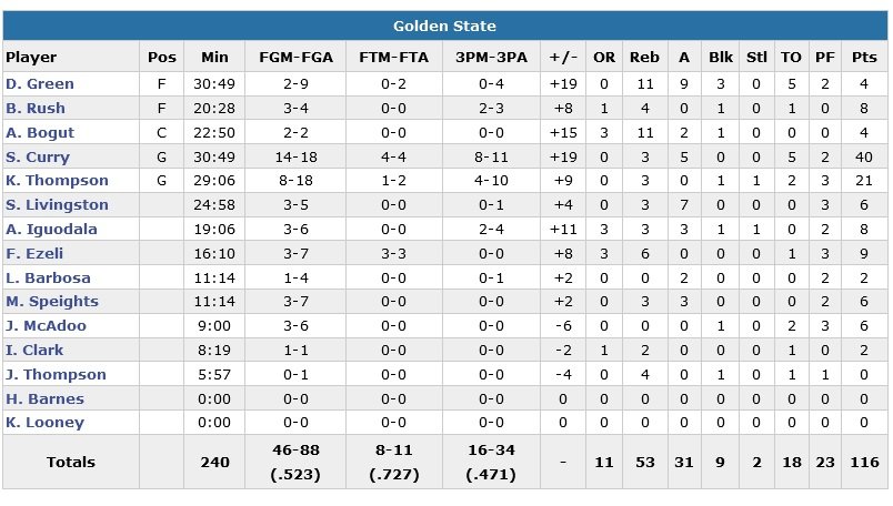 Mais le coup de folie de Curry derrière la ligne (et parfois à 9 mètres) met rapidement fin aux espoirs des locaux en milieu de 3e quart. C’est la 4e fois cette saison que le meneur des Warriors (16/34 à 3-points et un avantage 53-41 au rebond) marque 40 points après seulement 3 quarts-temps.