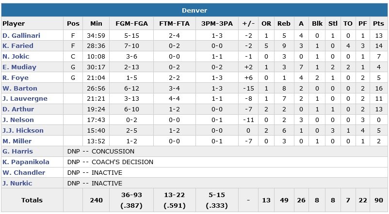 Gêné par une contusion au niveau du talon, Jimmy Butler apporte 19 points en 39 minutes, Derrick Rose avait lui oublié d’amener son shoot à la salle avec 12 points à 3/17 seulement. Denver perd de son côté un 8e match d’affilée avec 16 points de Will Barton et 14 points et 9 rebonds de Kenneth Faried. Gasol est en démonstration en 1ère mi-temps avec un 6/6 aux tirs pour démarrer et 12 points, Chicago est devant 51-46.