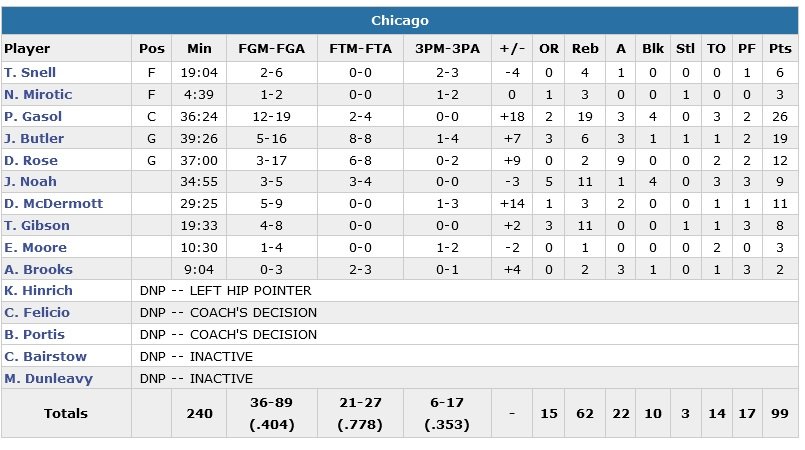 Énorme match de Pau Gasol cette nuit avec 26 points (12/19), 18 rebonds, 3 passes et 4 contres dans la victoire des Bulls (déjà vainqueurs des Spurs lundi) 99-90. L’Espagnol signe là son 5e double-double consécutif pour Chicago, qui remporte un 3e match en 4 rencontres.