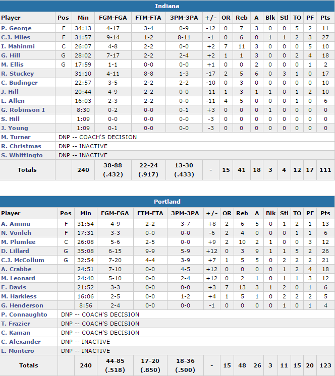 Comme souvent les Blazers ont construit leur succès sur leur adresse extérieure et cette nuit la défense d’Indiana a pris l’eau. Sous l’impulsion de Damian Lillard (26 points à 6/15 dont 5/9 à trois points), Portland a pu compter sur 6 joueurs à au moins 12 points, dont 21 pour CJ McCollum et 18 pour Allen Crabbe avec un total de 18 paniers réussis derrières l’arc en 36 tentatives. Portland a shooté à 51.8% contre seulement 43.2 aux Pacers. Avec en plus un Paul George à seulement 11 points à 4/17, compliqué de pouvoir espérer quelque chose malgré 27 points à 8/11 à trois points de CJ Miles et 35 points en combiné du duo George Hill (18 pts) – Rodney Stuckey (17 pts).