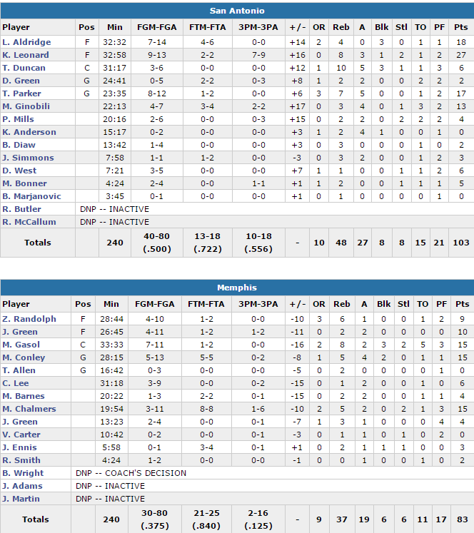 Memphis avait parfaitement entamé la rencontre en menant 9-2 puis 15-10 mais lors des 17 minutes suivantes ils n’ont inscrit que 21 points. Sous l’impulsion de David West et Manu Ginobili les Spurs sont revenus en fin de quart, puis ont pris la tête en début de second. Tony Parker a permis aux siens de faire le break avec un gros passage où il a inscrit 8 points d’un 11-4 qui a mis définitivement San Antonio devant. A la pause l’avance était de seulement 9 points mais Leonard et Aldridge ont fait exploser la défense des Grizzlies en inscrivant 14 des 15 premiers points des Texans. Après 7 minutes ils menaient 60-47 et Ginobili et Patty Mills sont venus se mêler à la fête pour contribuer à un 14-6 en moins de 4 minutes qui a porté l’avance à 19 points. Gregg Popovich a ensuite pu faire tourner puisque l’écart est monté jusqu’à 23 unités.