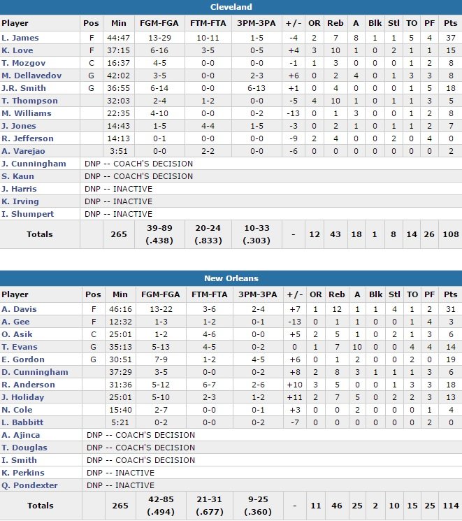 Davis a scoré 6 points en prolongation sur trois jumps shots à mi-distance pour offrir aux Pelicans un 5ème succès en 20 rencontres et infliger aux Cavaliers une 6ème défaite (13 victoires). Il a été très bien épaulé par Eric Gordon (19 points à 7/9), Ryan Anderson (18 points à 5/12), Tyreke Evans (14 points à 5/13, 7 rebonds et 10 passes) et Jrue Holiday (13 points à 5/10, 7 rebonds et 5 passes). Les Pelicans ont fait souffrir la défense des Cavs en shootant à 49.4%, contre seulement 43.8 aux hommes de David Blatt.