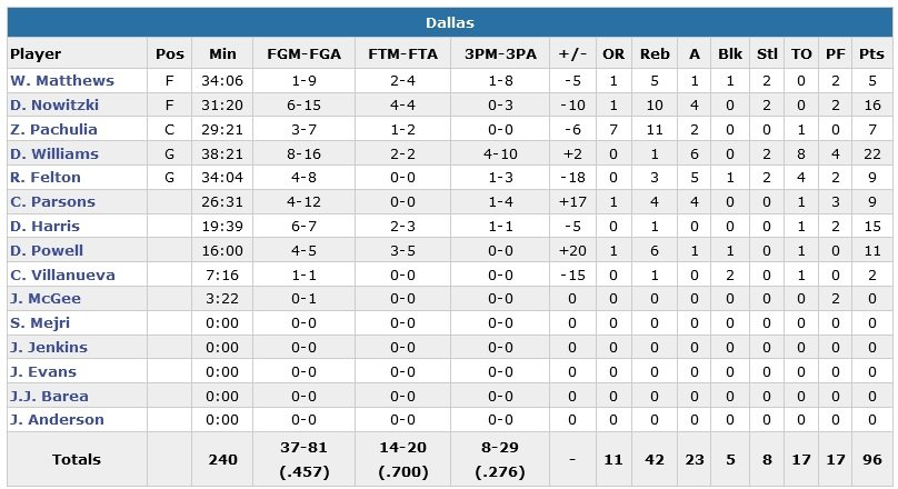 Dirk Nowitzki (touché à la hanche dans le dernier quart) termine lui à 16 points (6/15) et 10 rebonds mais rate un 3-points alors que son équipe était menée de deux points dans les 2 dernières minutes. Wesley Matthews n’aide pas puisqu’il termine à 5 points à 1/8 à 3-points. En face les Rockets shootent à 11/18 de loin en première mi-temps (4/4 pour Pat Beverley) avant d’en rater 7 sur 8 après la pause. Menés 57-53 après deux quarts-temps, les Mavericks (qui avaient démarré leur match sur un 20-15 au terme d’un 12-0 puis encaissé un 20-5 en fin de deuxième quart-temps) passent un 10-0 à leurs adversaires en fin de troisième pour passer devant 73-72. Les deux équipes sont à égalité 78 partout avant de jouer les 12 dernières minutes. Le score restera serré jusqu’à ce que Jones et Harden fassent la différence dans les dernières minutes.
