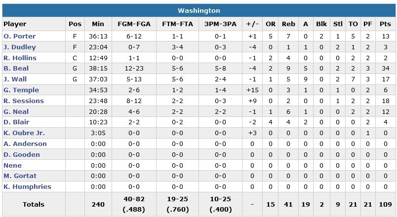 En tête 104-103 grâce à un 2+1 d’Otto Porter à 1’42, Washington s’offre trois points d’avance (106-103) sur un floater de Beal à 47.9 secondes. Bledsoe rentre un layup à 15.9 secondes mais Beal ajoute deux lancers à 11.6, 108-105 Washington. Knight tente un 3-points qui ne rentre pas à 8.8 secondes mais Beal commet la faute. Le meneur rentre un seul de ses trois lancers. Garrett Temple fait lui 1/2 à 6.3 secondes et Bledsoe manque une dernière tentative lointaine alors que le temps fait défaut aux visiteurs.
