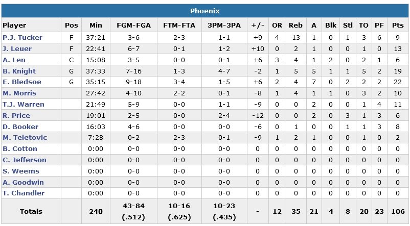 En tête 104-103 grâce à un 2+1 d’Otto Porter à 1’42, Washington s’offre trois points d’avance (106-103) sur un floater de Beal à 47.9 secondes. Bledsoe rentre un layup à 15.9 secondes mais Beal ajoute deux lancers à 11.6, 108-105 Washington. Knight tente un 3-points qui ne rentre pas à 8.8 secondes mais Beal commet la faute. Le meneur rentre un seul de ses trois lancers. Garrett Temple fait lui 1/2 à 6.3 secondes et Bledsoe manque une dernière tentative lointaine alors que le temps fait défaut aux visiteurs.