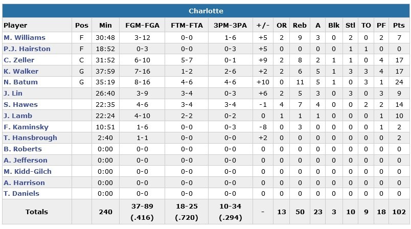 Charlotte est devant 52-50 à la pause, Walker marque 9 points, tous dans le premier quart-temps. Rose 10 et Butler est limité à 4/11.Les Hornets shootent à 46.7% sur les deux premiers quarts tandis que les Bulls sont à 43.8%. Les 12 minutes suivantes tournent à l’avantage des locaux, devant 75-72 avant de jouer le dernier quart. Batum rentre un 3-points important et obtient la faute en prime à 5 minutes du buzzer mais le Français manque son lancer. Butler obtient trois lancers derrière et rentre les trois mais Batum répond encore à 3-points, 94-91 Charlotte. Doug McDermott s’occupe d’égaliser de loin avant que son équipe ne prenne un 7-0 bouclé par l’ancien Blazer, à 2/2 sur la ligne, 101-94 et 17.6 secondes.