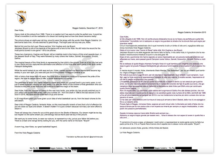 Cher gamin de Reggio Calabria, fantastique Kobe, dans ce pays qui t’aime tant, nous fermons les yeux et rêvons. Il y aura toujours une place dans notre club. Notre rêve est peut-être trop grand mais c’est peut-être le même rêve qu’avait inconsciemment ce petit garçon de 8 ans sur la photo. Nous voulons que tu reviennes à la maison pour porter nos couleurs et représenter notre ville comme ton père l’a fait. Il y a une famille noire et orange qui t’attend, avec le même nom sur le maillot: « Bryant »