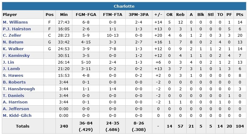 En difficulté au rebond cette saison et privé d’Al Jefferson (mollet), Charlotte domine cette fois sous les panneaux avec un avantage 57-41. En l’absence du pivot, Zeller a été efficace en cherchant la faute à l’intérieur, il rentre 10 lancers-francs sur 13 possibles. Les Hornets comptent 11 points d’avance à la mi-temps puis 26 en fin de troisième sur un dunk non contesté de Spencer Hawes, servi par-dessus l’épaule par Jeremy Lin.