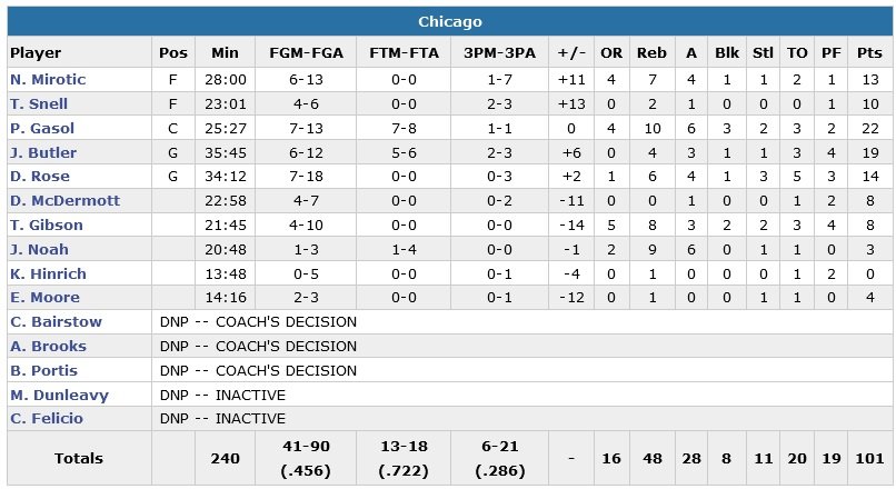 Brandon Knight inscrit de 17 de ses 21 points dans le 4e quart et Mirza Teletovic (20 points à 7/12) rentre le panier du match à 0.3 seconde de la sonnerie. En face Pau Gasol termine meilleur marqueur avec 22 points (7/13, 10 rebonds, 6 passes, 3 contres), suvi de Jimmy Butler (19 points à 6/12) et Derrick Rose (14 points à 7/18, 6 rebonds et 4 passes). Chicago (20 ballons perdus) fait la course en tête tout le match et fonce tout droit vers la victoire après 3 quarts-temps et au terme de 12 minutes très sérieuses en défense durant laquelle les Suns sont limités à 10 points à 4/20.