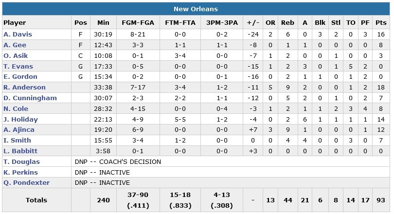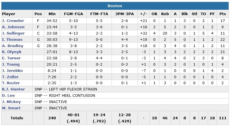 En manque de rythme car gêné par les fautes, Anthony Davis shoote à 8/21 pour 16 points, 6 rebonds et 3 contres. Ryan Anderson ajoute 18 points (7/17, 9 rebonds) pour les Pelicans et même si Jrue Holiday marque 14 points en sortie de banc, le backcourt Tyreke Evans – Eric Gordon n’a pas inscrit le moindre panier. Titulaire mais malade, Avery Bradley signe 11 points et participe au 12/28 des Celtics à 3-points avec un 3/5 personnel (14/24 sur ses 4 derniers matchs). Les Pelicans font la course en tête en première mi-temps mais encaissent un 13-2 (deux 3-points et un shoot à 4m de Thomas) en fin de deuxième quart qui permet à Boston de rejoindre les vestiaires avec un avantage 53-44.