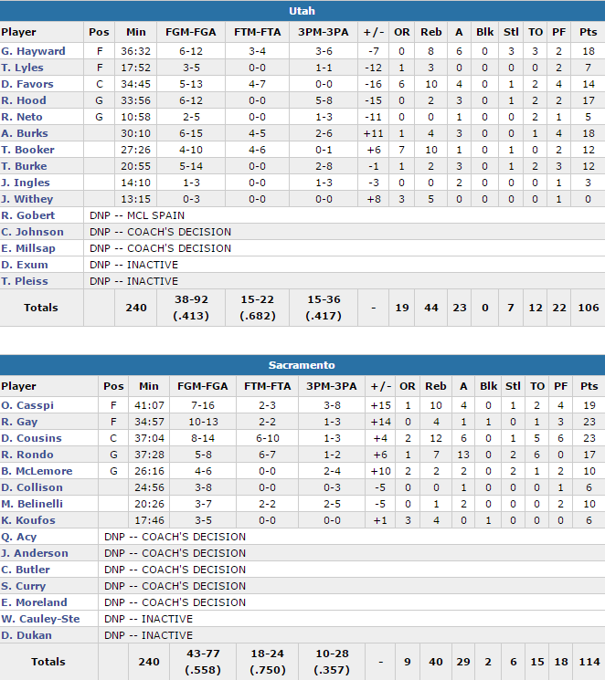 Cousins n’a pas été le seul à briller alors qu’en face Rudy Gobert était encore absent. Les Kings ont fait souffrir la défense du Jazz avec un superbe 55.8% aux shoots dont un 10/28 à trois points et 6 de leurs 8 joueurs à au moins 10 points. Rudy Gay signe 23 points à 10/13, Omri Casspi 19 points à 7/16 et 10 rebonds et Rajon Rondo 17 points, 7 rebonds et 13 passes. Les Kings ont rapidement pris 12 points d’avance sur un 14-4 et n’ont plus jamais regardé derrière avec une avantag 36-22 après 12 minutes.
