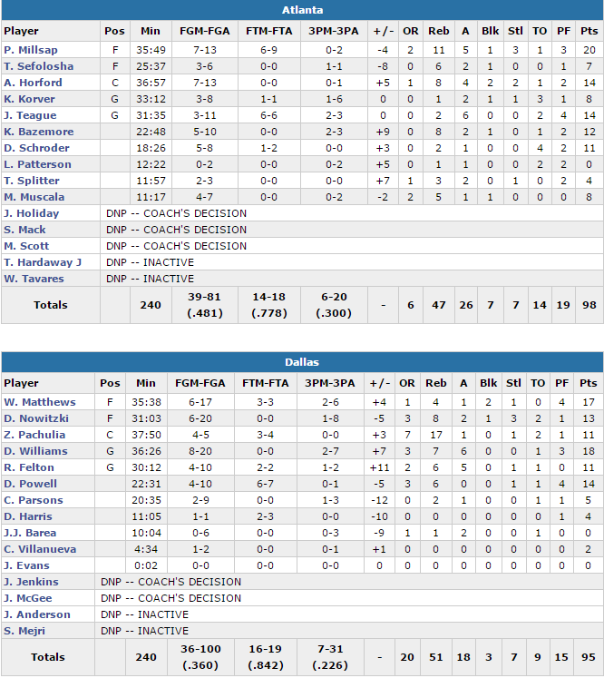 Cependant malgré cette maladresse, les Hawks n’ont jamais pu vraiment tuer le match, où il y a eu pas moins de 20 changement de leader et 11 égalités. Atlanta était devant 49-44 à la pause, soit le plus gros écart de la première mi-temps à la faveur d’un trois points de Bazemore. Raymond Felton et Powell ont combiné 16 points en troisième quart pour garder les leurs dans la rencontre mais grâce une nouvelle fois à Kent Bazemore, auteur de deux paniers en fin de quart, Atlanta a entamé les 12 dernières minutes devant 76-72. Dallas s’est accroché et a fini par revenir et même passer devant sur un 7-0 initié par Matthews. A 3’07 de la fin, sur 7 points de suite de Williams les hommes de Carlisle pensaient même avoir fait le plus dur (93-89) avant de craquer comme on l’a vu précédemment.