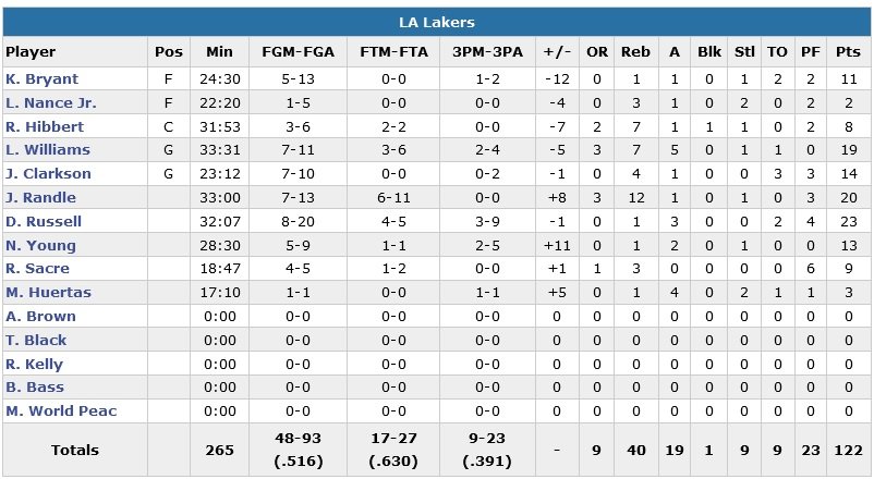 D’Angelo Russell bat lui son record en carrière avec 23 points à 8/20 tandis que Julius Randle signe 20 points à 7/13 et 12 rebonds sans pour autant réussir à éviter une 19e défaite en 22 matchs aux Lakers. Bryant rentre ses 3 premiers shoots (dont un 3-points) mais ne shootera ensuite qu’à 2/10. Le public passera néanmoins les 4 dernières minutes du match à chanter « We Want Kobe ! ». Martin, qui shootait jusque-là à 31% en 15 matchs, rentre 6 de ses 9 tentatives lointaines et marque 17 points dans le quatrième quart-temps.