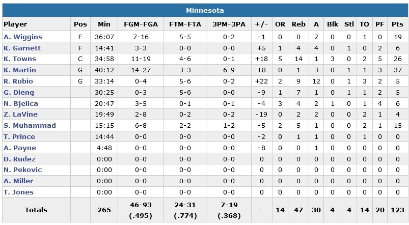 Wolves et Lakers ont fait durer le suspense jusqu’au bout cette nuit au Target Center, où Kevin Garnett (6 points à 3/3, 4 rebonds et 4 passes en 14 minuts) et Kobe Bryant (11 points à 5/13 en 24 minutes) s’affrontaient pour la dernière fois à Mineapolis. Kevin Martin et Karl-Anthony Towns ont été intenables avec 37 points à 14/27 et 26 points à 11/19 et 14 rebonds et permettent à Minnesota de s’imposer après prolongation, 123-122.