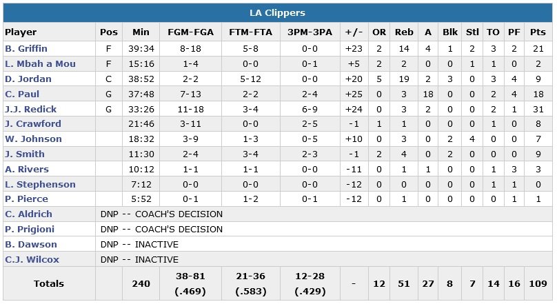 Les Clippers ont accéléré en seconde mi-temps pour se débarrasser des Bucks, 109-95 cette nuit. J.J. Redick sort son meilleur match de la saison avec 31 points à 11/18, parfaitement accompagné par les 21 points (8/18) et 14 rebonds de Blake Griffin et un Chris Paul en mode maestro : 18 points (7/13) et 18 passes. DeAndre Jordan se fait plus discret en attaque mais gobe tous les rebonds (9 points, 19 rebonds, 3 contres).