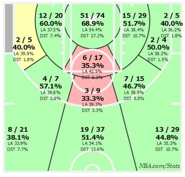 En regardant cette infographie, vous réaliserez de toutes façons très vite qu’il n’y a que très peu d’endroits sur le terrain où le franchise player du Thunder pêche. C’est toute la franchise d’OKC qui en profite pour le moment !