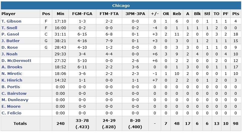 Chicago revient à nouveau dans le match et prend la tête suite à deux 3-points signés Brooks et Kirk Hinrich, 73-70. Evans redonne deux points d’avance aux siens à 3-points 79-77 à 7’31. Les deux équipes à égalité 89 partout, Davis manque deux lancers-francs. Gordon enchaîne sur un layup pour un bref avantage des visiteurs mais Brooks à 3-points puis Gasol remette Chicago dans le droit chemin, 94-91 et 2’05 à jouer. Davis se rattrape en complétant un 2+1 à 1’47, Brooks lui répond par un layup, 96-94 à 40 secondes. Derrick Rose (9 points à 4/10, 3 rebonds, 3 passes) enfonce le clou à 11.5 secondes, 98-94. Evans manque ensuite sa chance à 3-points juste avant le buzzer.