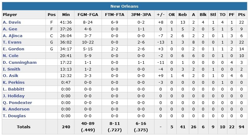 La star des Pelicans termine à 22 points (8/24, 13 rebonds, 4 contres), tout comme Tyreke Evans (10/22, 8 passes), mais New Orleans tombe à 1-11 à l’extérieur cette saison. New Orleans prend jusqu’à 11 points d’avance dans le premier quart-temps, profitant des 7 ballons perdus des Bulls. L’équipe d’Alvin Gentry prend jusqu’à 14 points d’avance avant d’encaisser un 12-4 qui ramène Chicago (36.6% en première mi-temps contre 46.5% pour New Orleans) à 45-42 à la pause. Les Pelicans démarrent leur troisième quart sur un 12-5 pour reprendre 10 points d’avance, 57-47.