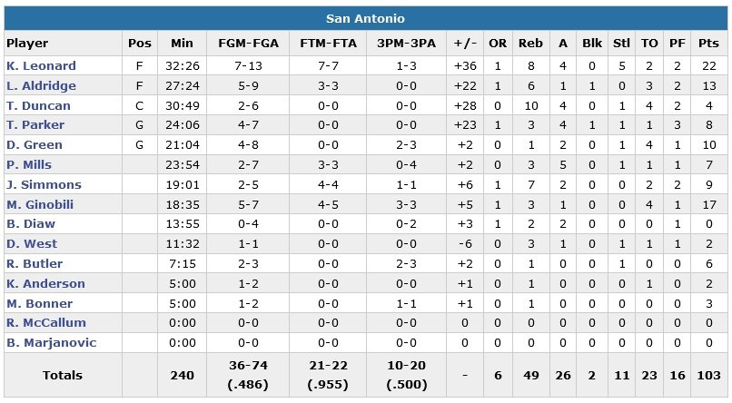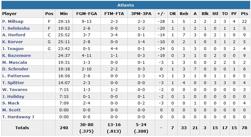 Les Hawks marquent 13 points dans le premier quart-temps, 12 dans le deuxième, et les Spurs mènent 47-25 (plus petit total de la saison pour n’importe quelle équipe et n’importe quelle mi-temps cette saison) à la pause. Manu Ginobili ajoutent 17 et 13 points alors que Paul Millsap termine meilleur marqueur des Hawks avec 22 points (dont 17 dans le troisième quart-temps.
