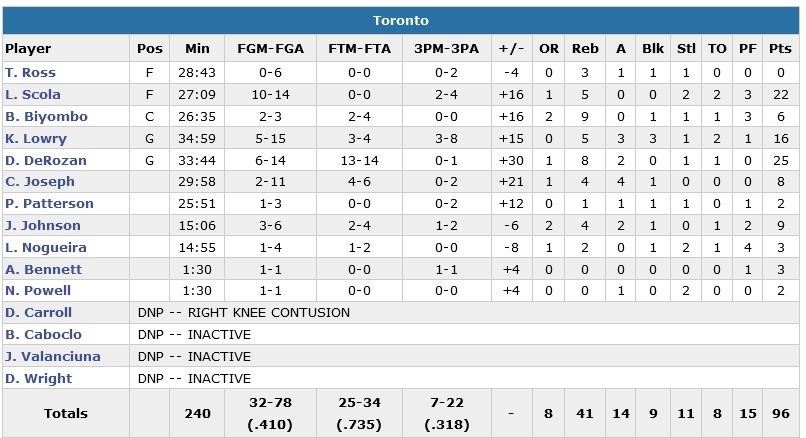 Les Raptors sont devant 32-24 après un quart-temps (14 points à 6/8 et 5 rebonds pour Scola) bouclé sur un 24-8. À la pause, l’équipe de Dwane Casey est devant 52-44 et les 76ers se maintiennent grâce à un 7/14 à 3-ponits alors que les deux équipes shootent à 17/41. Les locaux ne shootent qu’à 40% au bout de trois quarts-temps mais mènent 69-58, leurs adversaires n’étaient guère plus adroits (34%). Okafor réduit l’écart au maximum à 6 points à 7’16, 77-71, mais Toronto répond par 5 points d’affilée pour reprendre 11 points d’avance et filer tout droit vers la victoire.