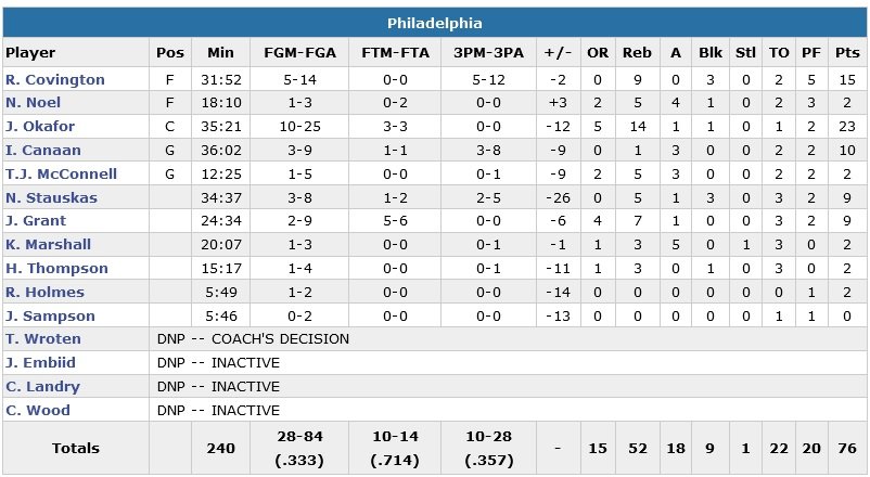 Toronto démarre tranquillement par un 16-8 en milieu de premier quart-temps avant de dérouler sereinement jusqu’au buzzer. Les 76ers de Jahlil Okafor (23 points 14 rebonds, 7e double-double de la saison) et Robert Covington (15 points et 9 rebonds) ont de leur côté fait preuve de volonté (52 rebonds à 41) mais perdent un nombre de ballons bien trop élevé (22 à 8) tout en ne shootant qu’à 33.3% sur le match et encaissent ainsi une 6e défaite d’affilée.