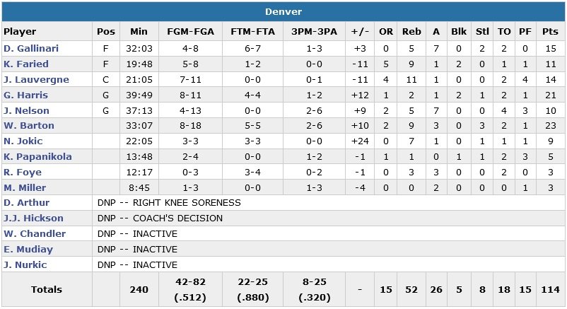 C’est la troisième victoire en autant de matchs de Denver sur les Rockets cette saison. Gary Harris bat son record en carrière avec 21 points tandis que Joffrey Lauvergne se révèle extrêmement efficace en 21 minutes seulement avec 14 points à 7/11 et 11 rebonds. Six joueurs des Nuggets signent au moins 10 points, Danilo Gallinari terminant 3e meilleur scoreur de son équipe avec 15 points à 4/8, 5 rebonds et 7 passes. Même chose pour Houston du côté du nombre de scoreurs à minimum 10 unités, James Harden menant la charge avec 24 points à 9/20 et 6 passes.