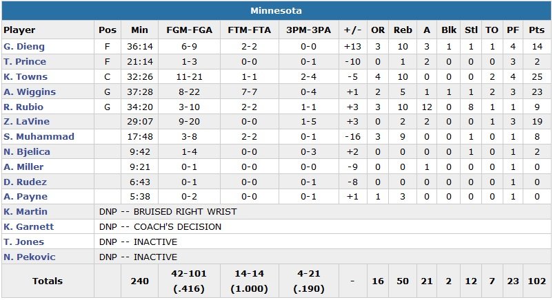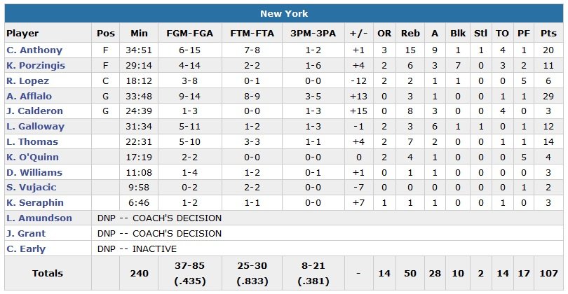 Carmelo Anthony est passé à une passe d’un triple-double cette nuit avec 20 points, 15 rebonds et 9 passes dans la victoire des Knicks 107-102 sur Minnesota. Il a été bien aidé par les 29 points d’Arron Afflalo et les 11 points, 6 rebonds, 6 contres (tous en première mi-temps) et 3 passes de Kristaps Porzingis.