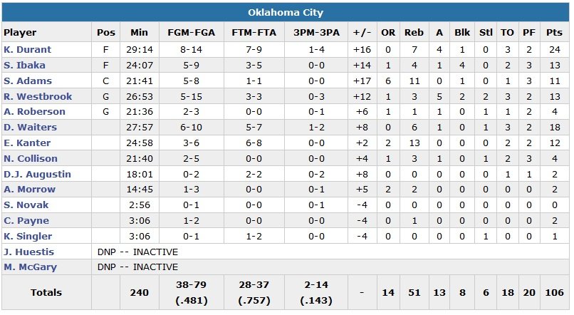 OKC contrôle la première mi-temps même si les trois 3-points de Portland dans la dernière minute de la première mi-temps réduisent l’écart à 52-45. Le Thunder démarre son 3e quart sur un 10-2 pour tranquillement reprendre ses esprits, 62-47. Waiters obtient quelques minutes plus tard le layup plus la faute et son lancer-franc fait passer le score à 86-67. Durant marque 15 points dans le 3e quart (9 en première mi-temps).