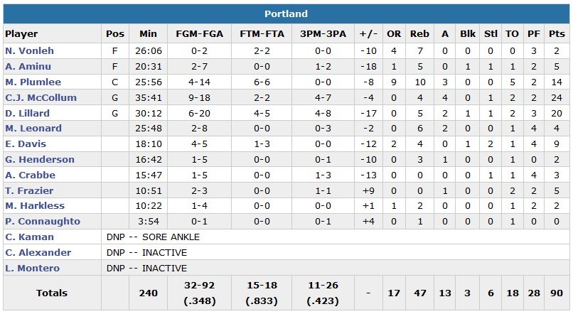 Dion Waiters score ainsi 18 points, Enes Kanter ajoute 12 points et 13 rebonds et Steven Adams un autre double-double avec 11 points et 11 rebonds. Le Thunder tient au passage pour la 7e fois consécutive ses adversaires à moins de 100 points. Serge Ibaka termine lui à 13 points, 4 rebonds et 4 contres. En face C.J. McCollum et Damian Lillard (limité à 0 point à 0/9 en seconde mi-temps, il s’est également légèrement tordu la cheville dans le deuxième quart en essayant d’éviter Ibaka) apportent respectivement 24 et 20 points à Portland, qui ne shoote qu’à 35%.
