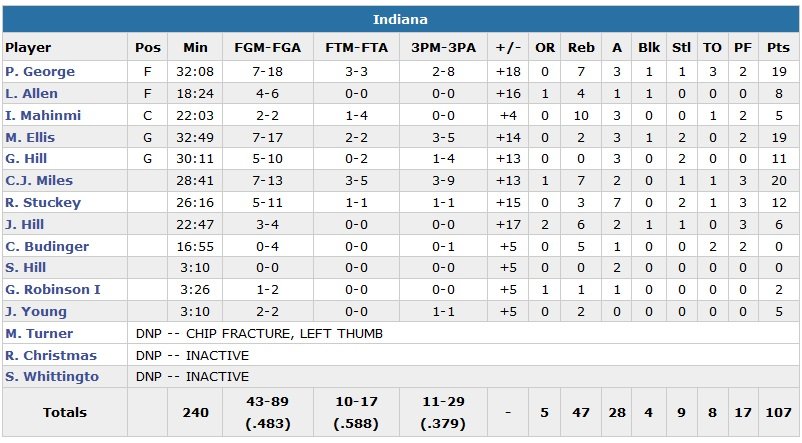 La performance d’Ellis est contagieuse dans le 4e quart-temps, à l’image de C.J. Miles (20 points) qui rentre deux 3-points dans la période. Indiana passe un 32-17 aux Mavericks dans le 4e et prend jusqu’à 26 points d’avance. Rodney Stuckey et George Hill ajoutent respectivement 12 et 11 points. Dallas perd 12 ballons dans le match (qui mènent à 17 points des Pacers). Les deux équipes shootent à seulement 30% dans le premier quart-temps mais Indiana a su se rattraper en shootant à 48% sur l’ensemble du match. Les Mavericks eux terminent à 36% avec Raymond Felton en meilleur marqueur et Dirk Nowitzki seul autre Mav à minimum 10 points avec 13.