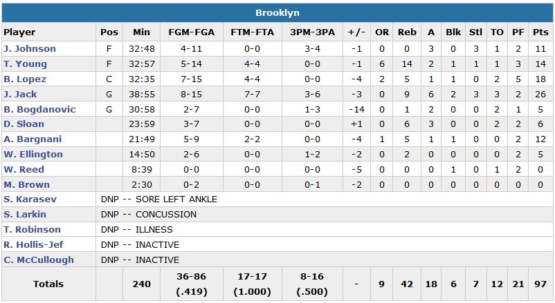 Jarrett Jack a signé son 2e meilleur match offensif de la saison avec 26 points pour ce premier match à l’extérieur depuis le 28 novembre pour Brooklyn. Thaddeus Young est en double-double avec 14 points et 14 rebonds alors que Brook Lopez ajoute 18 points à 7/15 et 5 rebonds. Les deux équipes à égalité 83 partout, Indiana passe un 21-14 à ses adversaires en partie grâce aux bons rebonds et paniers de Hill (11 rebonds dont 5 offensifs). Les Pacers mènent alors 104-92 à 90 secondes avant que Jack et Joe Johnson ne combinent pour 5 points dans un dernier effort.