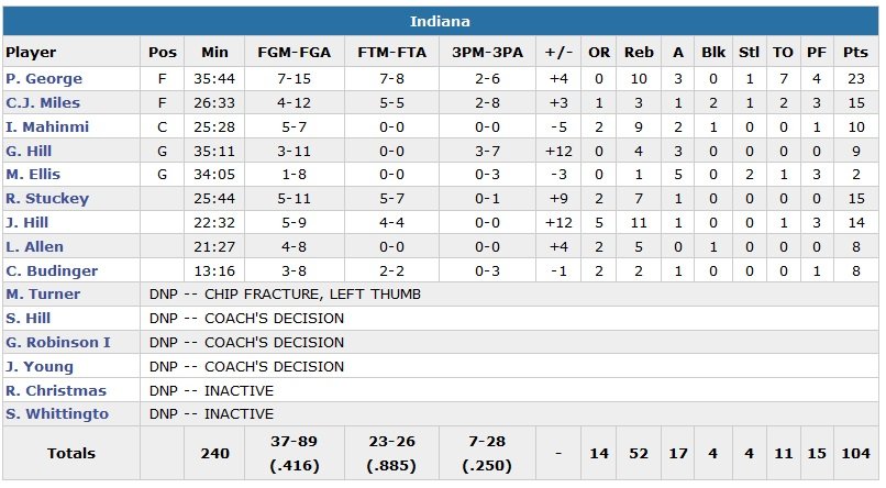 3e victoire consécutive et 4e victoire en 5 matchs pour les Pacers hier, vainqueurs des Nets (4e défaite d’affilée) 104-97. Paul George termine meilleur marqueur d’Indiana avec 23 points (7/15, 10 rebonds, 3 passes) et les remplaçants Jordan Hill (14 points et 11 rebonds) et Rodney Stuckey (15 points et 7 rebonds) lui donnent un bon coup de main.