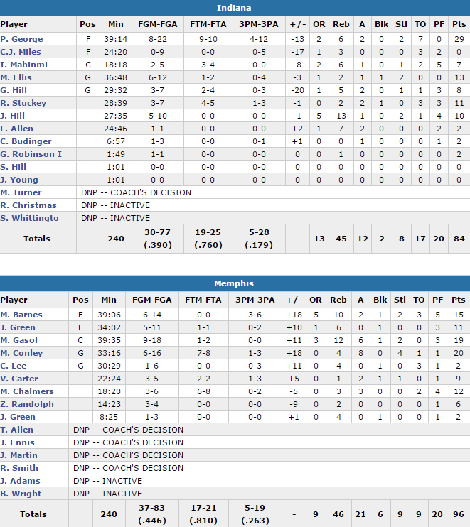 C’est sur la défense que les hommes de Dave Joerger se sont appuyés pour aller chercher ce succès en limitant Indiana à 39% et en les poussant à perdre pas moins de 17 ballons à l’image du match de Paul George, auteur de 29 points mais à seulement 8/22 et avec 7 ballons perdus. En attaque ils s’en sont remis au trio Marc Gasol (19 points à 9/18, 12 rebonds, 6 passes), Mike Conley (20 points à 6/16, 4 rebonds, 8 passes et 4 interceptions) et Matt Barnes (15 points, 10 rebonds). A noter les 12 points en sortie de banc de Mario Chalmers. En face hormis George, les Pacers ont eu le plus grand mal à marquer des points avec 13 points à 6/12 pour Monta Ellis et 11 points pour Rodney Stuckey, et un très moche 5/28 derrière l’arc.