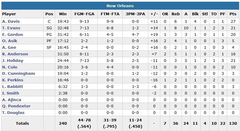 Anthony Davis (27 points, 6 rebonds et 4 contres) est ainsi accompagné de trois coéquipiers à 20 unités ou plus : 21 points, 8 rebonds et 10 passes pour Tyreke Evans, 21 points 3 rebonds et 5 passes signés Jrue Holiday et enfin 20 points 3 rebonds et 3 passes d’Eric Gordon. Davis, malade, a quitté le match dans le premier quart-temps avant de revenir dans le quatrième.