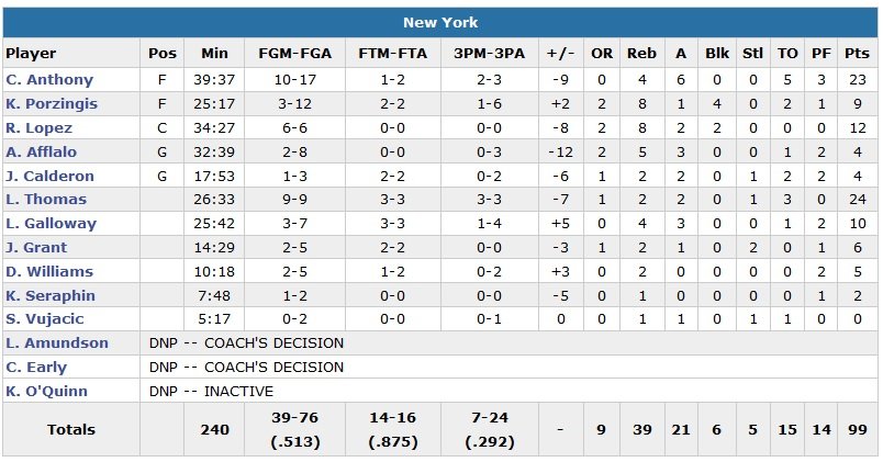 Tobias Harris y va de ses 20 points (7/14) alors que côté Knicks (7/24 à 3-points contre 10/22 pour Orlando) Lance Thomas égalise son record en carrière avec 24 points à 9/9, juste devant Carmelo Anthony (23 points à 10/17, 4 rebonds et 6 passes) au scoring. Kristaps Porzingis est limité à 9 points à 3/12, 8 rebonds et 4 contres. Elfrid Payton n’a pas joué la seconde mi-temps en raison d’une cheville gauche douloureuse mais cela a permis à Fournier de davantage manier le ballon et à Victor Oladipo et Mario Hezonja d’inscrire respectivement 12 et 11 points dans une équipe qui shoote à 51% sur le match.