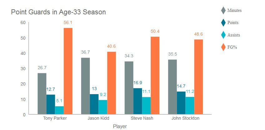 Et Tim Duncan, qui a su modifier son régime alimentaire et son jeu (en acceptant un rôle plus réduit) pour perdurer, est un très bon exemple pour le n°9. Sa vitesse déclinant également, Parker s’en remet davantage à son adresse. Selon NBA.com, la vitesse moyenne du meneur est de 7.4 km/h cette saison. Il est moins rapide que Patty Mills, Danny Green ou encore Ray McCallum.