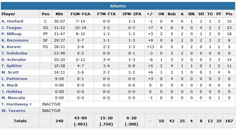 À noter : Dennis Schröder (14 points à 5/12) tourne à 16.8 points de moyenne sur les 5 derniers matchs dans lesquels il a pris au moins 10 shoots. Tiago Splitter a battu son record en saison avec 11 points.