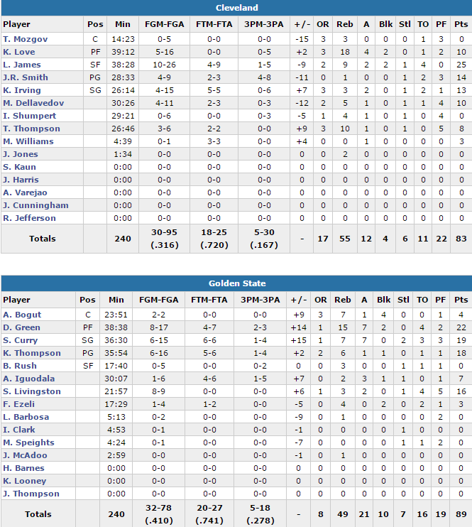 Si l’intensité était bien présente, le niveau de jeu n’était pas vraiment au rendez-vous avec deux équipes d’une extrême maladresse (31.6% pour les Cavs et 41% pour les Warriors) à l’image des deux stars Stephen Curry (19 points à 7/15, 7 rebonds et 7 passes) et LeBron James (25 points à 10/26 et 4/9 aux lancers). Les deux hommes du match ce sont Draymond Green (20 points à 8/17, 14 rebonds et 7 passes) et le remplaçant Shaun Livingston (16 points à 8/9). Klay Thompson a tout de même été aussi précieux avec 18 points à 6/13. Côté Cavs Jr Smith marque 14 points mais le trio Kyrie Irving (13 points à 4/15), Kevin Love (10 points à 5/16 et 18 rebonds) et Matthew Dellavedova (10 points à 4/11) a arrosé.