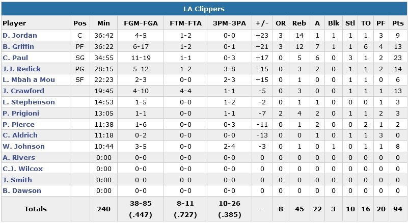 Roy Hibbert marque les 8 premiers points des « locaux » sur les 4 premières minutes du match mais les cadres des Clippers se partagent bien le scoring et J.J. Redick à 3-points offre un +8 aux siens, 17-9. Un bon passage de D’Angelo Russell (7 points en 1 minute) ne suffit pas face au duo Chris Paul (17 points à 8/11 à la pause) – DeAndre Jordan (7 points et 10 rebonds à la mi-temps) et c’est ensuite au tour de Pablo Prigioni et Jamal Crawford de prendre le relais alors que les Lakers enchaînent les ballons perdus et sont menés de 10 points après 12 minutes, 32-22. Kobe Bryant tente de venir à la rescousse son équipe toujours menée de 10 longueurs mais ses 9 points (dont deux 3-points) en 3 minutes n’y font rien, l’équipe est encore à -10 à 4 minutes de la mi-temps, 47-37. Les Clippers bouclent leur 2e quart sur un 11-5 conclu par un 3-points de Luc Mbah a Moute servi par Griffin, 60-44.
