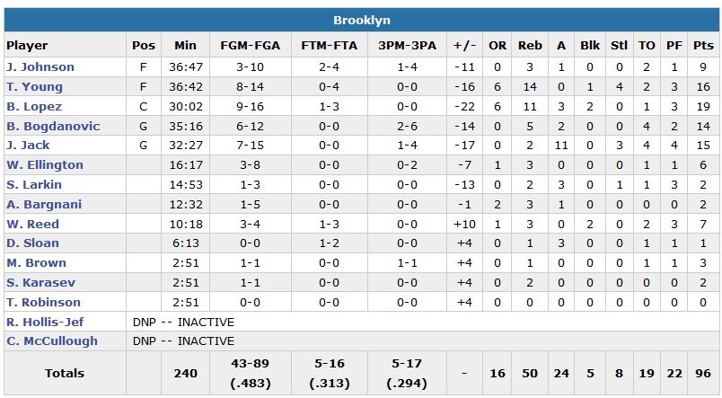 Wall compte 9 matchs à au moins 20 points et 10 passes ce mois-ci. En face Brook Lopez est en double-double avec 19 points et 11 rebonds pour les Nets, qui perdent un 6e match de rang à domicile, tout comme Thaddeus Young avec 16 points et 14 rebonds. Washington prend 12 points d’avance en première mi-temps mais Brooklyn va recoller au score puis reprendre l’avantage dans le 3e quart-temps. Revenus à 79-77, les Wizards bénéficient de l’apport extérieur d’Eddie, qui lâche un 4/4 de loin pour aider son équipe à passer un 23-7 à Brooklyn (9 ballons perdus dans le 4e) dans la dernière période. Wall boucle un 13-0 sur un layup, 102-84.
