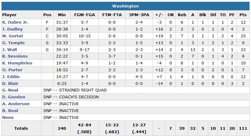 Gary Neal et Bradley Beal blessés, John Wall (22 points, 13 passes) a encore élevé son niveau de jeu cette nuit pour venir offrir aux Wizards une 4e victoire consécutive, 111-96. Marcin Gortat ajoute 25 points et le rookie Jarell Eddie quatre 3-points et 12 points dans le 4e quart-temps pour ses grands débuts en NBA. Les Wizards sont de retour à 50% de victoires.