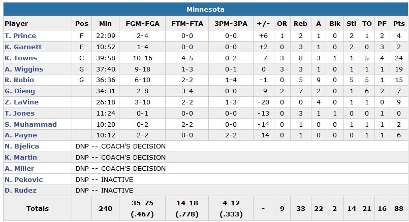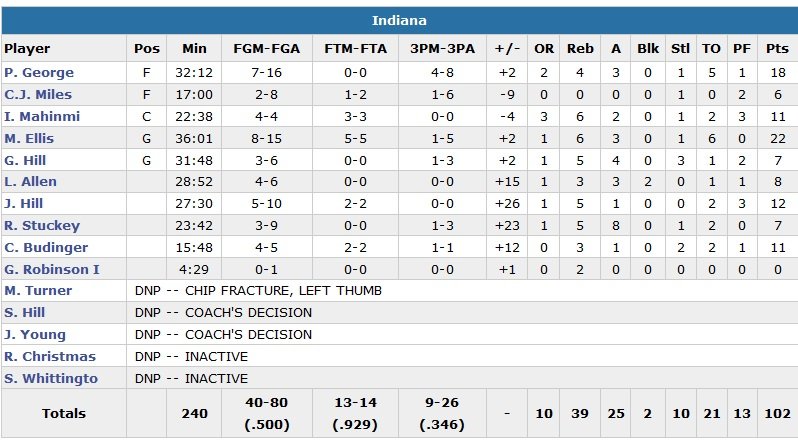 Les deux équipes totalisent 45 ballons perdus et le début de match compliqué des Pacers contient 5 pertes de balles sur les 5 premières minutes, ainsi que deux violations des 24 secondes. Devant de jusqu’à 7 points dans la dernière minute en début de 4e, les Wolves vont encaisser un 16-2 décisif. Ils reviendront quand même à 86-84 sur un 3-poinst de Rubio mais George et Rodney Stuckey (7 points, 5 rebonds, 8 passes) rentre deux tirs primés consécutifs pour tuer le match.