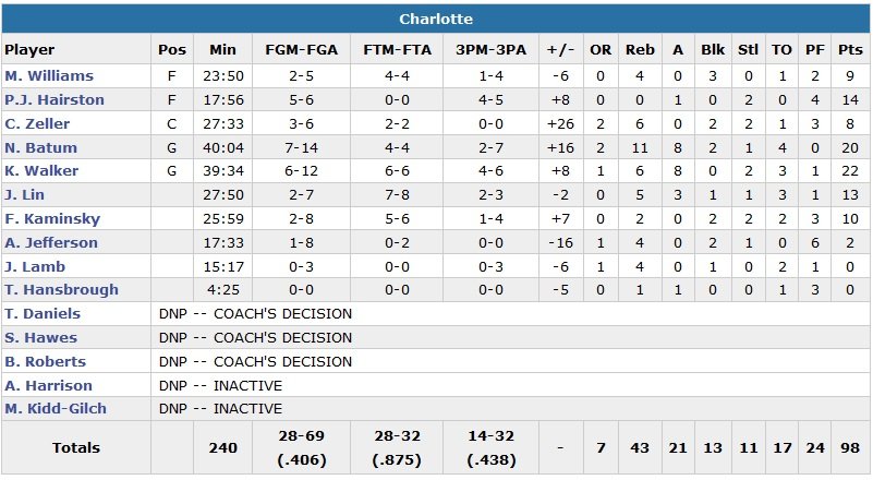 Charlotte repasse devant 89-88 sur un layup de Walker à 1’55. Il enchaîne avec un 3-points à 40 secondes du buzzer pour donner 4 points d’avance aux Hornets, 92-88. Charlotte (20 pertes de balles, record en saison) boucle son match sur un 6/6 aux lancers-francs dans les 23 dernières secondes pour briser la série de 3 victoires de leurs adversaires (11/21 aux lancers-francs et 14 ballons perdus).